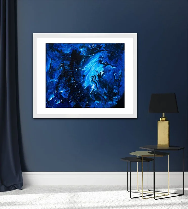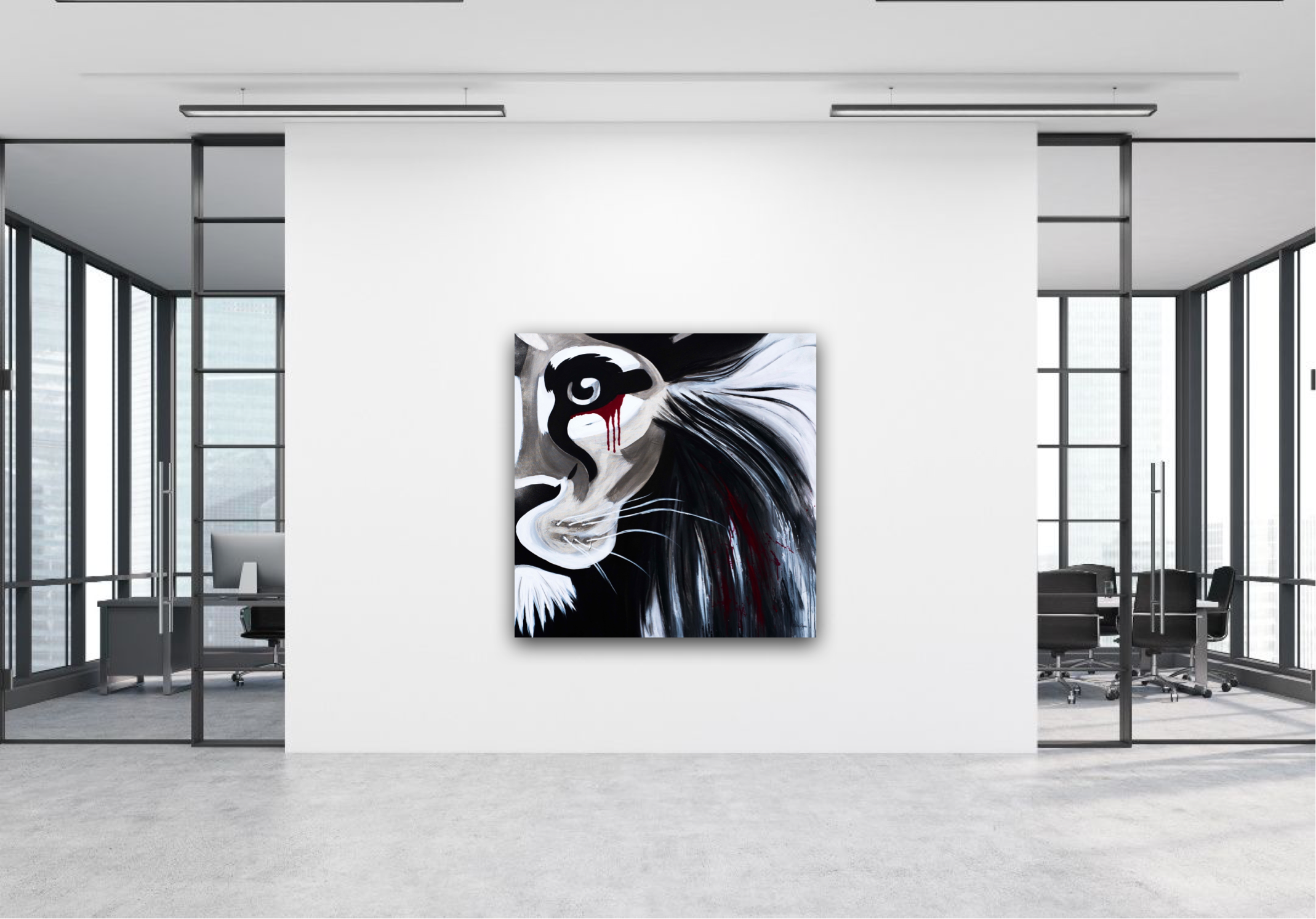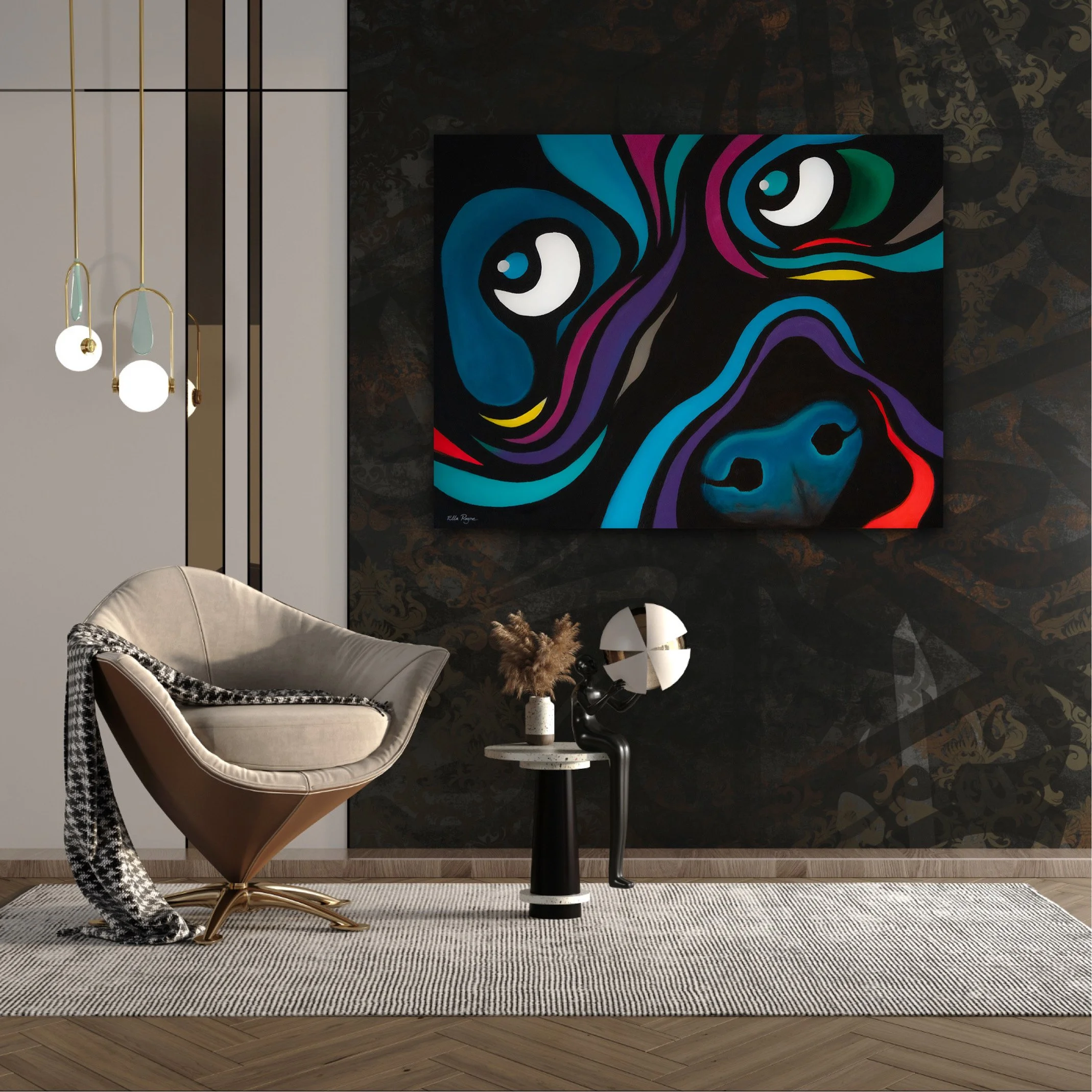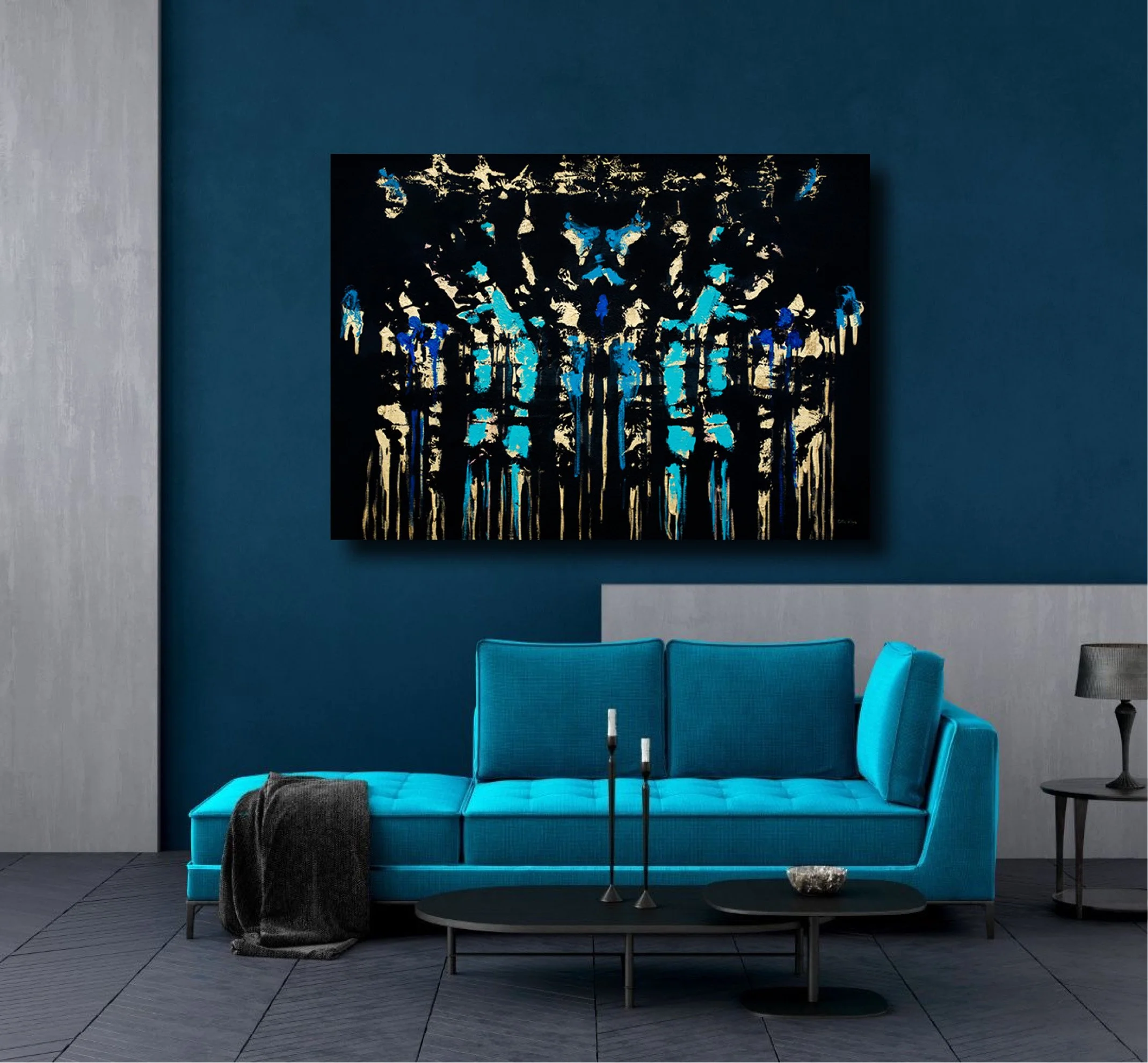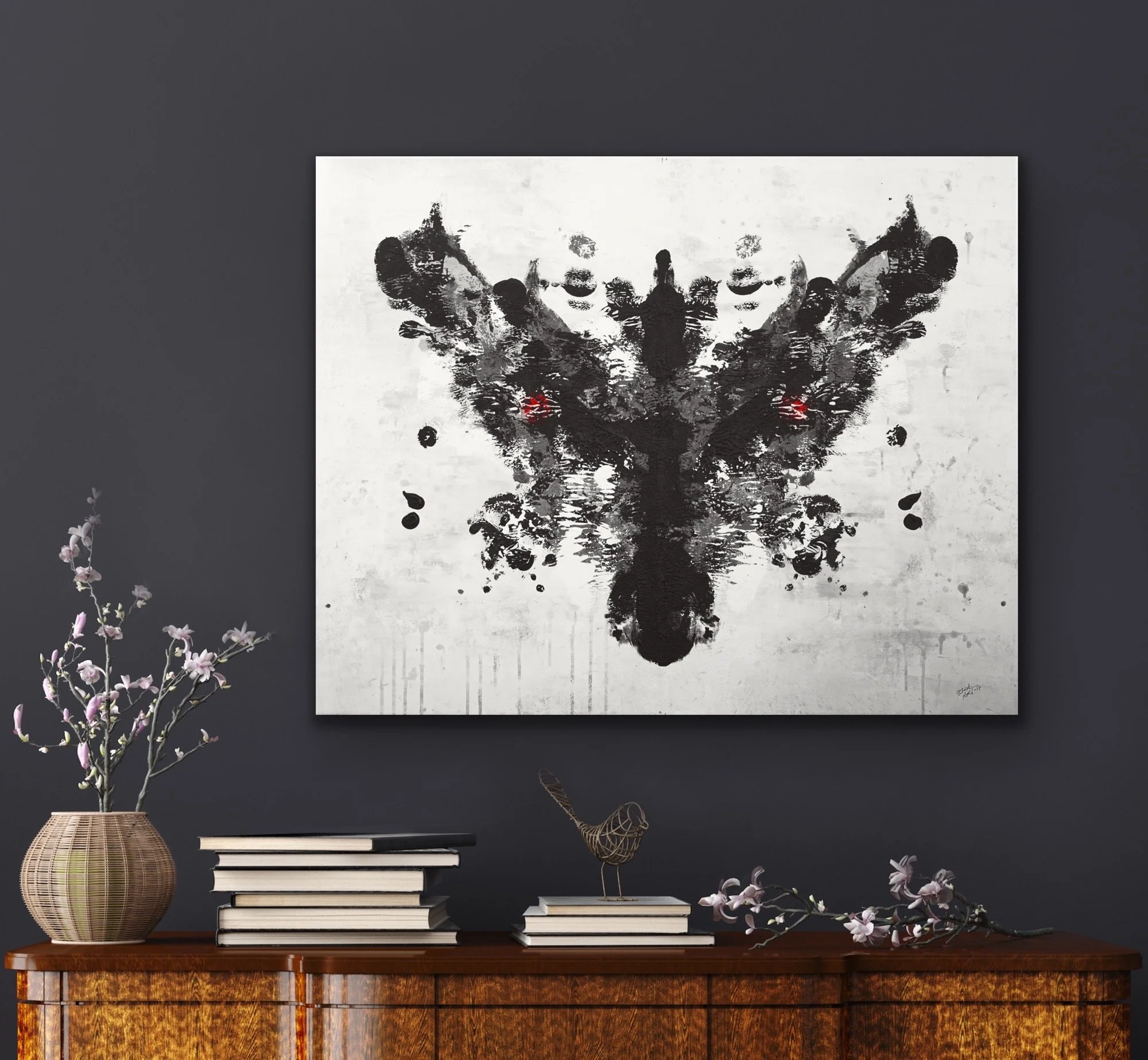 Dette maleriet er skapt med Rorschach-teknikken, et uttrykk som inviterer deg til å se nye former, dyr og mennesker i motivet. Et kunstverk som speiler både fantasi og følelser, og som endrer seg hver gang du ser på det.